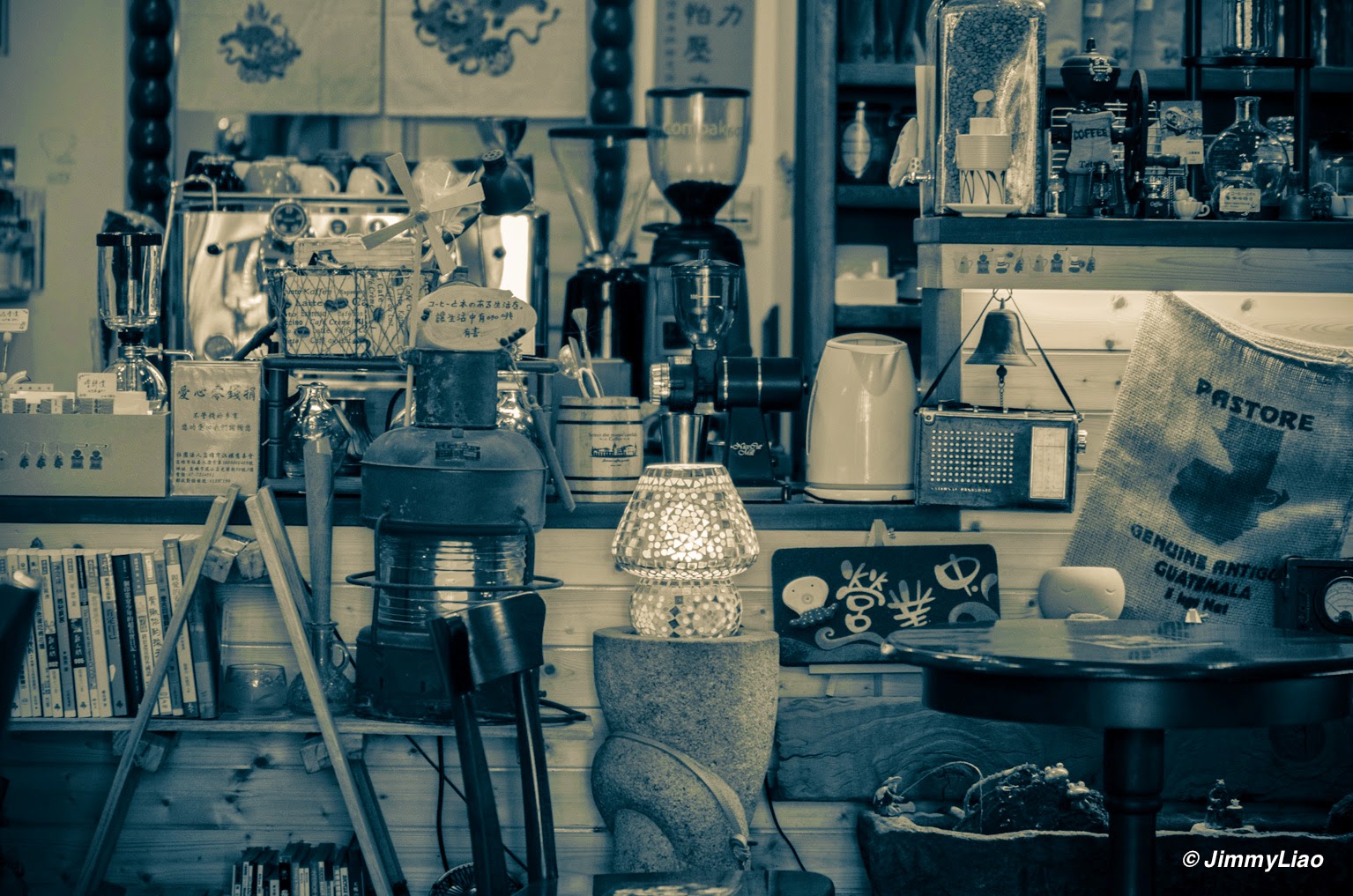 與老闆談天後才知道,老闆以前長年經商於日本,所以對於日本大大小小知名景點瞭若指掌,間尖的吉米還發現店中的擺設品有幾台純手動的底片相機,一問之下原來也是個攝影迷吶!一拍即合!對於咖啡的熱情,從店中飄香的咖啡味就知道,老闆對於咖啡的講究實在高人一等,不只器皿齊全外,就連一般很少曝光的烘培機也陳列在店中。